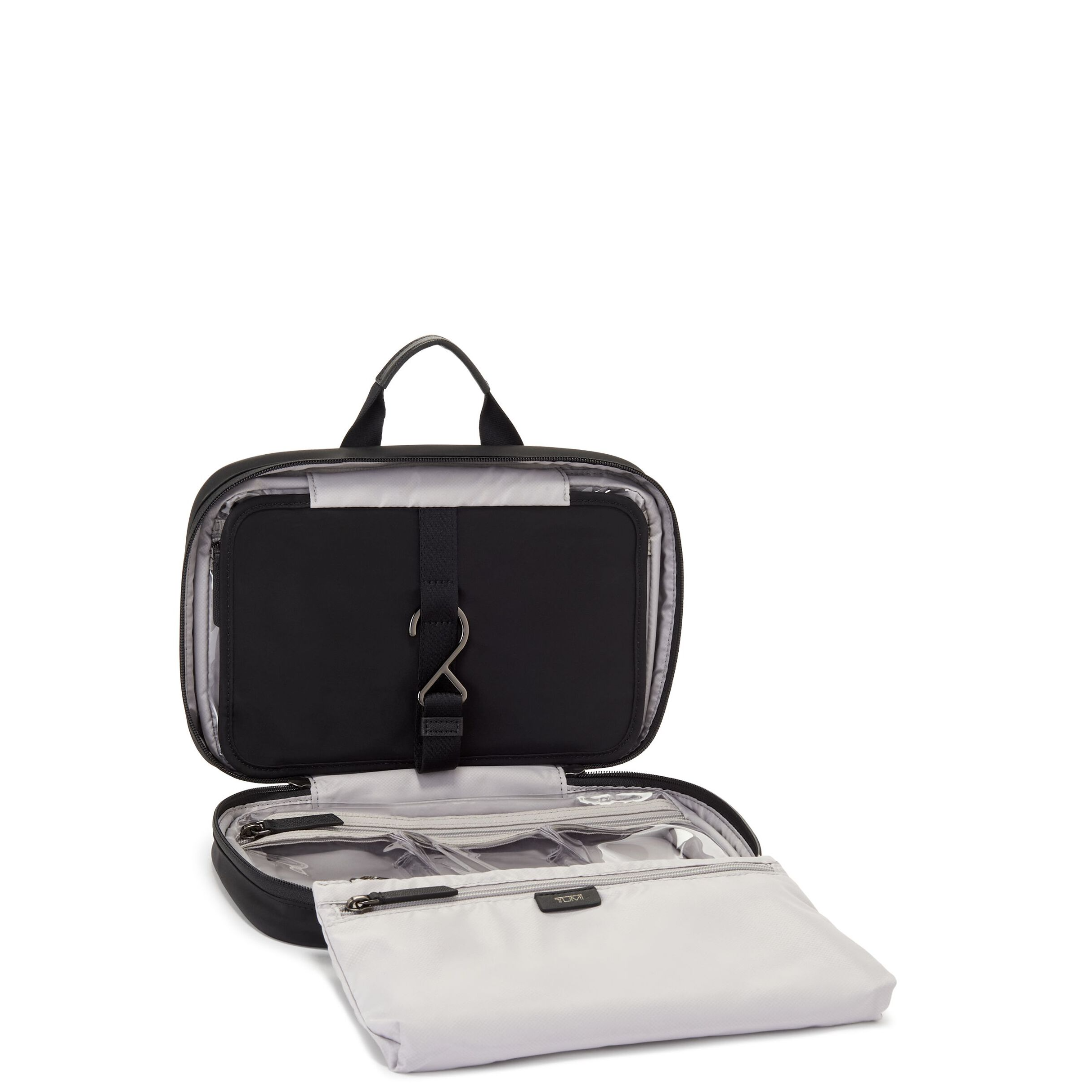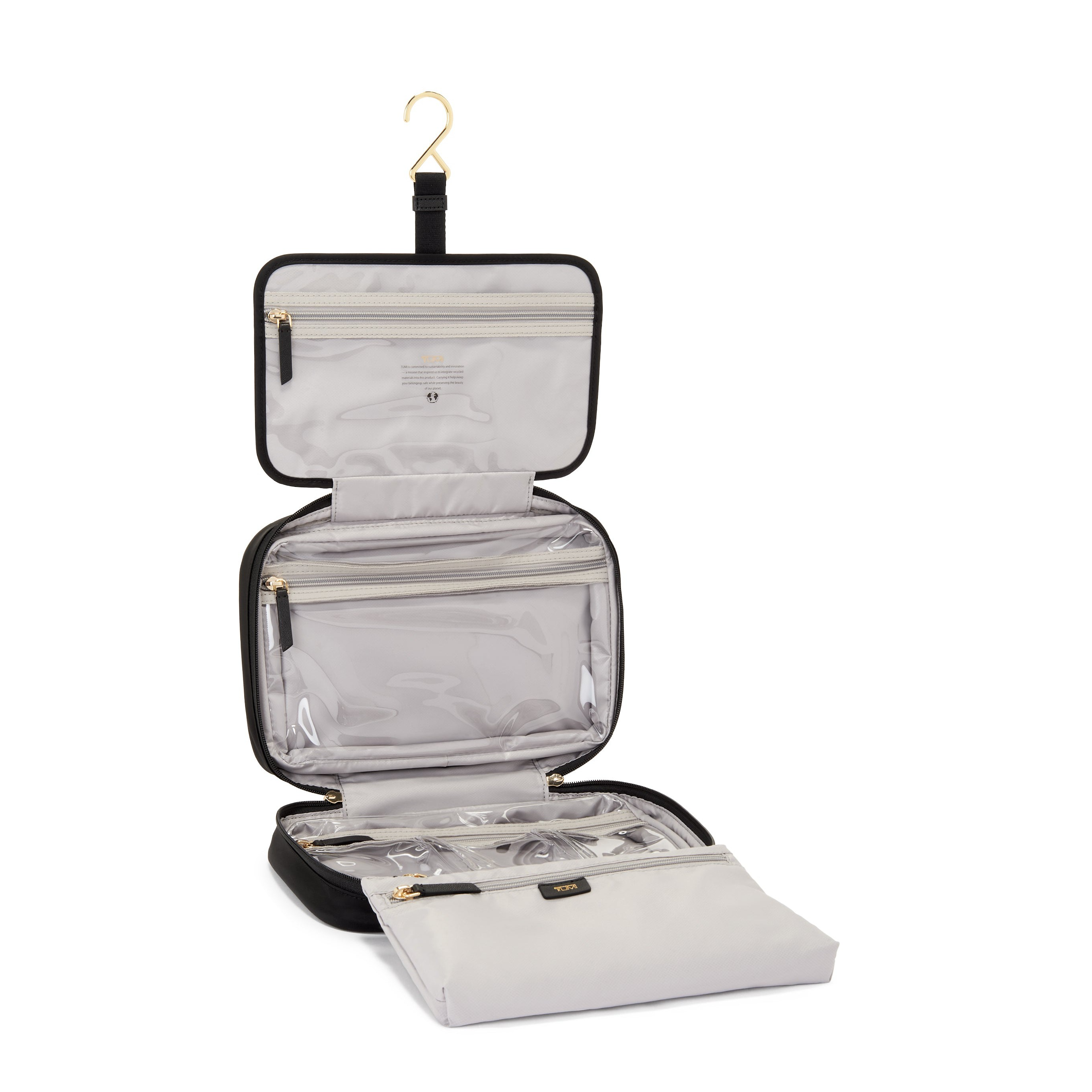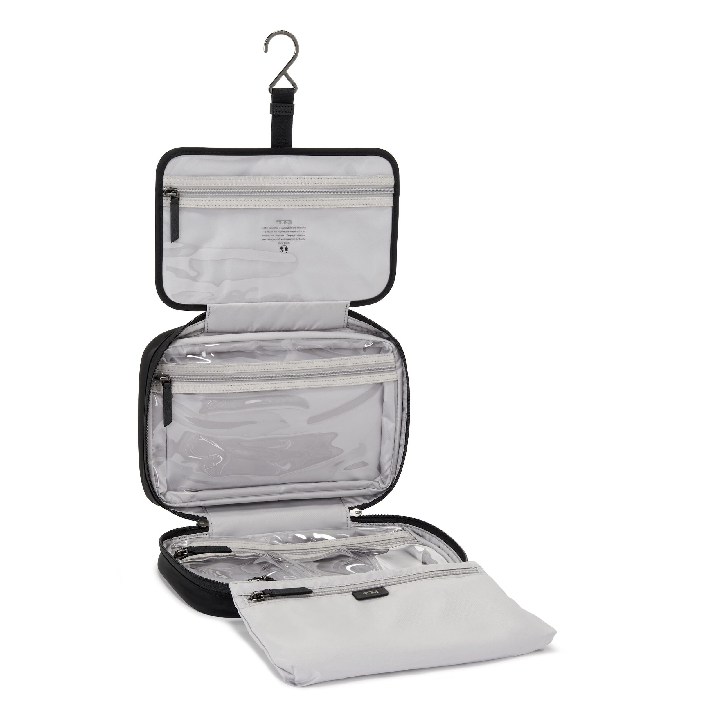 - 3 transparent zip pockets with wipeable lining